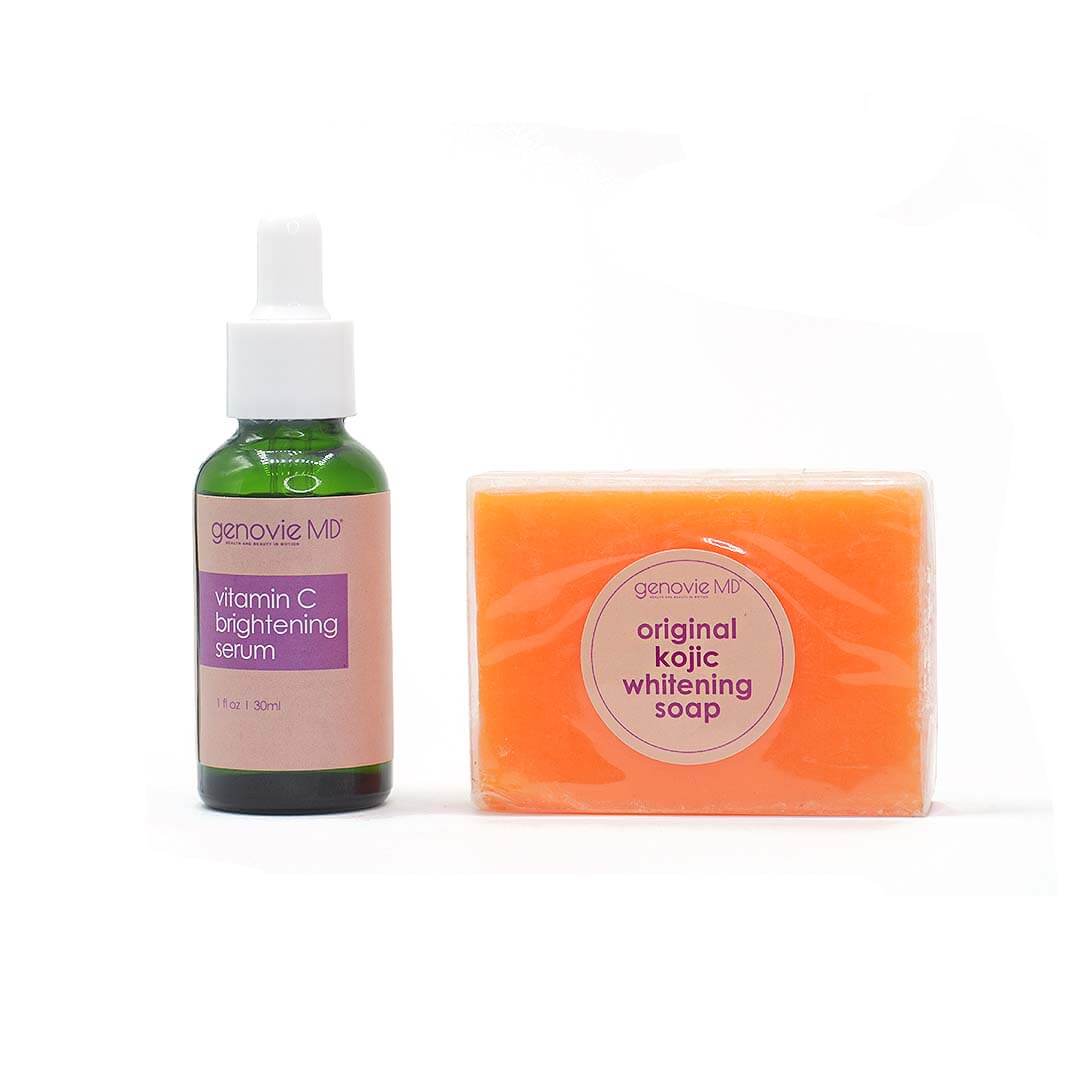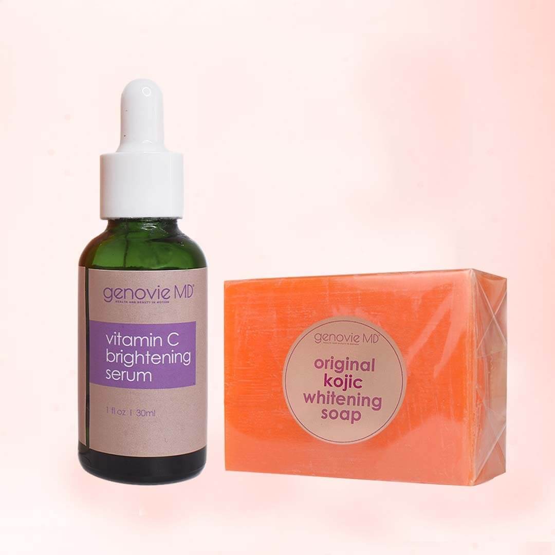Are you looking for the perfect combination to brighten your skin? Fade away dark spots and blemishes with Genovie’s Brightening Duo, featuring the Vitamin C Brightening Serum and Original Kojic Whitening Soap. This powerful combination is ideal for your day and night routine.